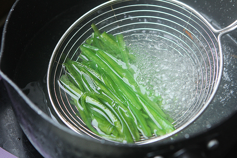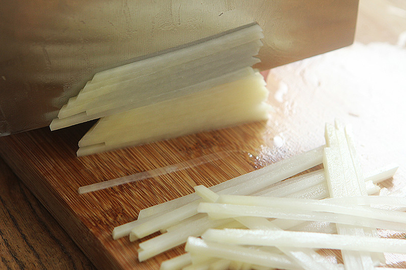 2、焯完的土豆丝一定要用清水镇一下,拌出的土豆丝就不会软烂了,根根爽脆。