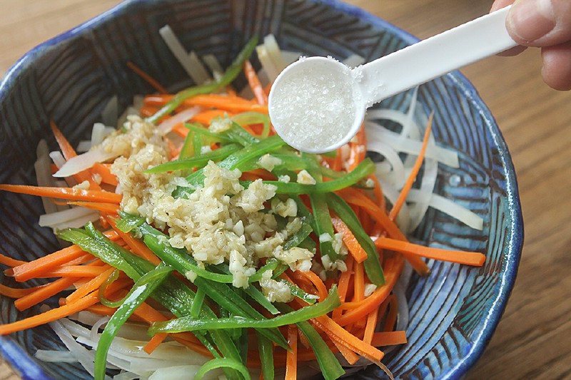 1、切好的土豆丝一定要用清水泡一下,这样拌出的土豆丝颜色干净漂亮。