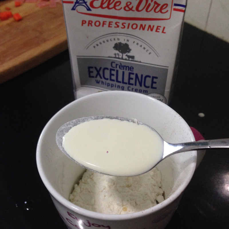 这个快手早餐必须推荐一下--奶油火腿马克杯蛋糕,这是一款咸蛋糕。有奶油的香味,咸鲜的口感,非常好吃。没有淡奶油用牛奶代替;没有火腿用火腿肠代替;没有马苏里拉芝士用芝士片代替。当然,口感会略差一点点!