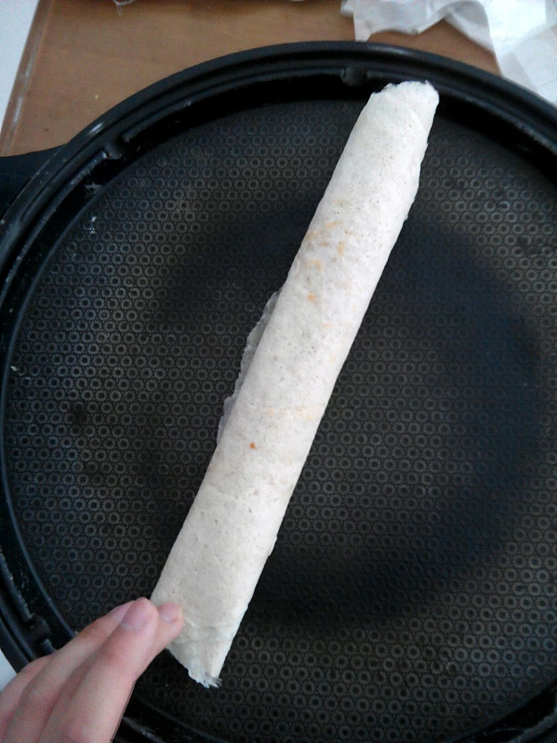 有喜欢吃鸡蛋的可以将煎饼上先涂一层蛋液,然后再放菜,要想煎饼更脆的话,关掉电源不要立即开盖子,等一分钟再开盖子效果会更好。一般煎饼买来时都比我这分大,可以在卷好馅料后,用刀切开分两半,这样就可以放入电饼铛里了,有兴趣的友友快来试试吧