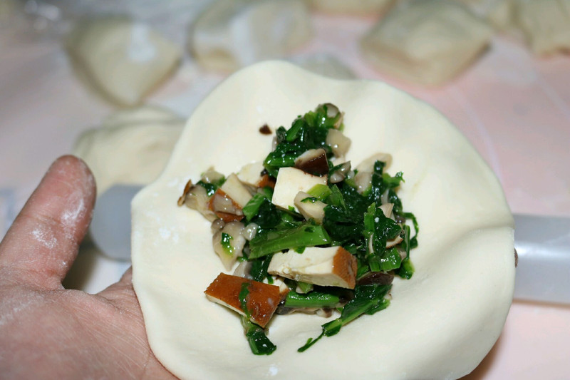 先做馅儿:莴笋尖开水悼一分钟,切碎,挤干水分,豆腐干开水悼一下切碎,新鲜香菇洗干净,切碎,在锅里倒入少量油,把香菇炒的水分收干就好!然后混合所有材料,放冰箱冷藏2小时左右!我就冷藏了40分钟,馅儿也更容易入味!