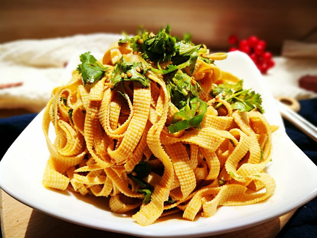 凉调豆腐皮口感会比较干,所以多加些汁料会润滑一些