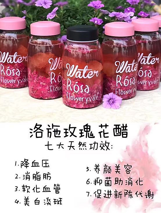 首先,无花不女人,我喜欢玫瑰花,所以平时在喝,也将它用来制作各种美食。比如这款玫瑰醋,主要功效为❤ 1、降血压,软化血管、美白、减肥、去色班,抑菌的功效。 2、玫瑰醋可促进新陈代谢,帮助消化、调节生理机能、养颜美容、青春永驻、减少疲劳感,更让人容光红润、精神旺盛,使肌肤看起来更年轻。