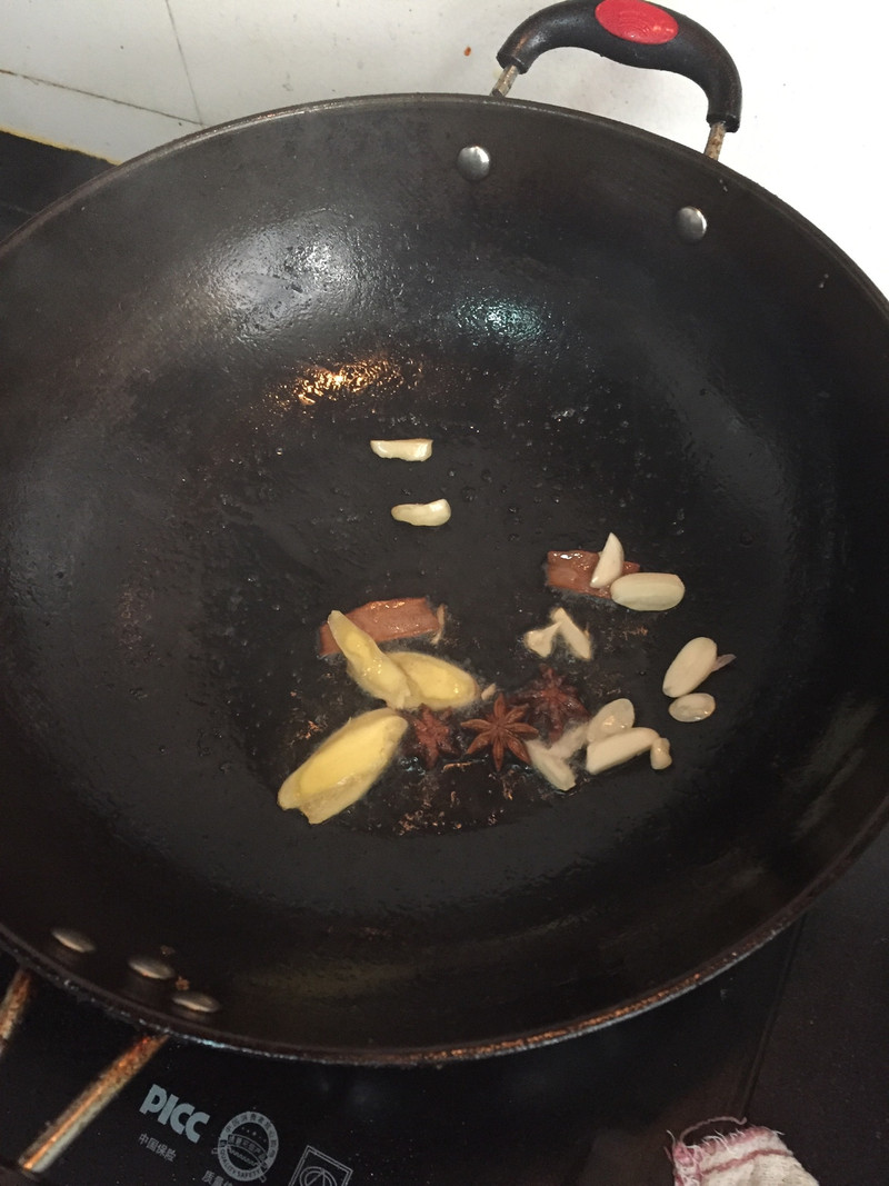 带皮五花肉,白糖,生抽,调料酒,八角,葱段,蒜,生姜,老抽,香叶,盐,味精