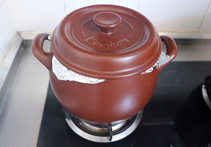 2、 干烧前要确保砂锅是干燥的,是完全没有吸收水份的。我这个是新到手的砂锅,我用拧干的湿毛巾擦拭干净,就可以直接烤了。