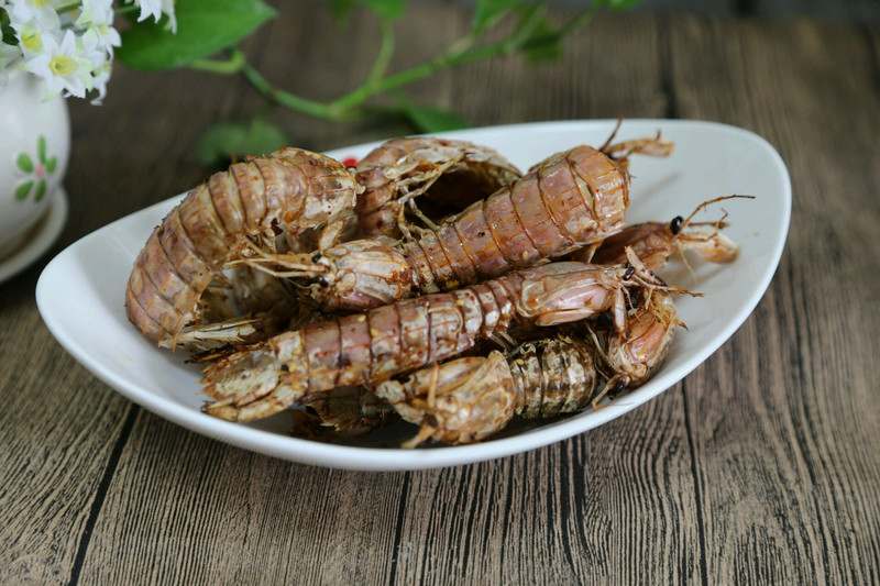超级简单快捷的一道菜。定的时间久了一点。结果歪打正着。皮也成酥脆的了。吃完真的连指头也嗦溜两下哈哈。皮皮虾是今天出海捞上来的新鲜的不要不要的,白灼一部分。留了一部分空炸。