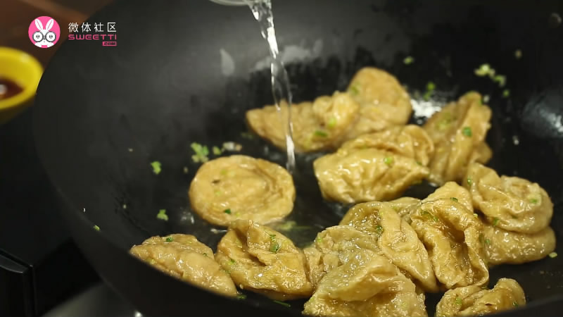 油面筋烫的时候不要戳孔也不要撕碎,不然炒完口感会很烂。