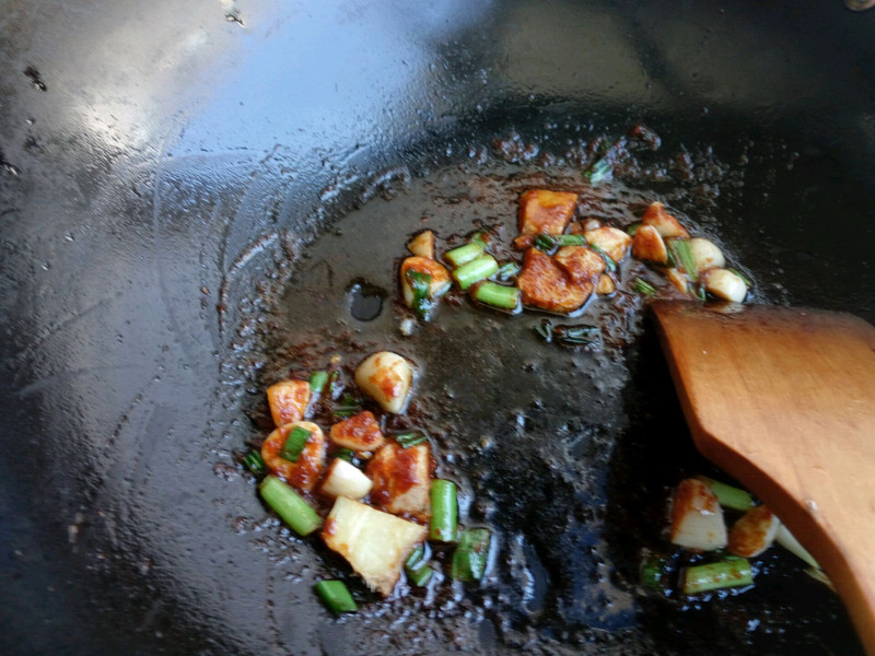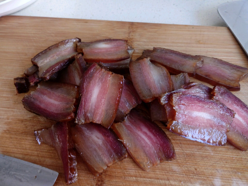 腊肉很咸,用热水煮一下去盐分,使肉变软。肉片干煸一下,去除油脂,使肉片有干香的口感。杏鲍菇焯一下,去除菌类的味道,节省时间。这道菜没加盐,辣酱和酱油的咸度够了。
