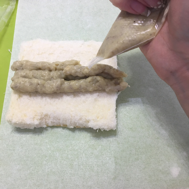 这是一款香甜的芝士土司卷,吐司被百吉福芝士片卷着,吐司里面卷的是香蕉蛋奶酱,狂爱香蕉的我超爱~