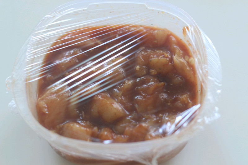 烤肉酱用的大喜大的,鸡肉切成中等大小的块就好。麦片用的生麦片,也可以用熟的那种或者薯片!
