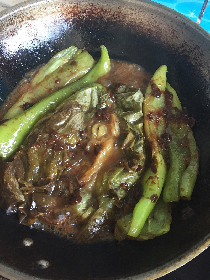 此时茄子已经很软了,除了茄子头部,用铲子和筷子将茄子分开,方便炖制时入味。5勺酱,水加到微微没过茄子和尖椒,盖锅盖炖