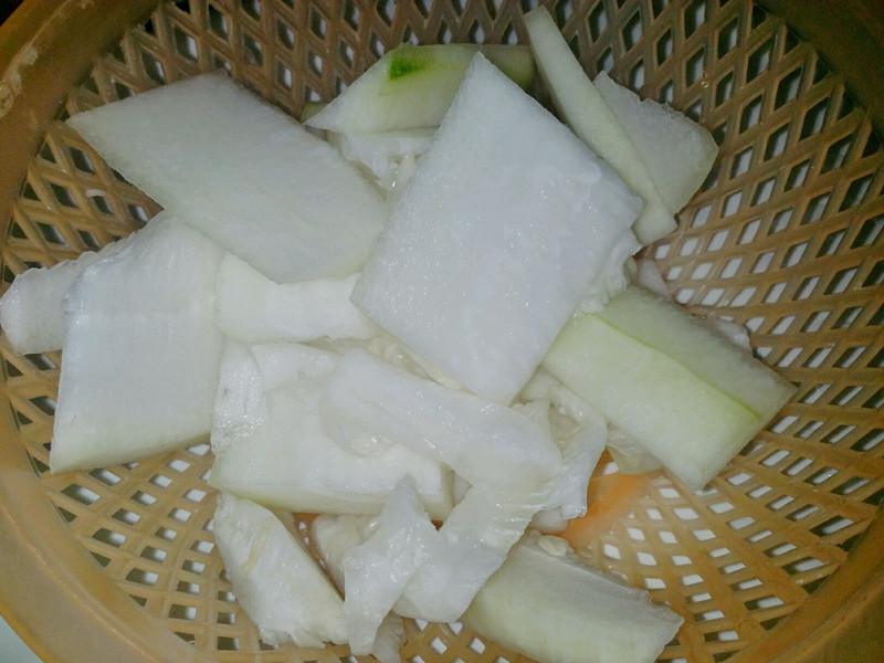 冬瓜切成片,注意厚度,太薄易烂,太厚不易熟。