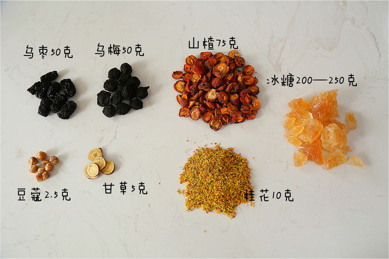 酸梅汤古来即为上好的夏日饮品。清代经御膳房改进成为宫廷御用饮品,所谓“士贡梅煎”即是。因其除热送凉,安心痛,祛痰止咳,辟疫,生津止渴的功效,被誉为“清宫异宝御制乌梅汤”,后来传入民间,于是大街小巷,干鲜果铺的门口,随处可见卖酸梅汤的摊贩。网络上酸梅汤的配方有很多,做法也都雷同,我大概查了一下,好多人的做法都是错误的。酸梅汤里所用的食材都属于中药材,会熬中药的人都知道,中药必须用砂锅煎煮,而且一副中药必须要煎两次,这样才能充分的将中药中的成分都析出,这样做出来的酸梅汤也特别的浓郁。