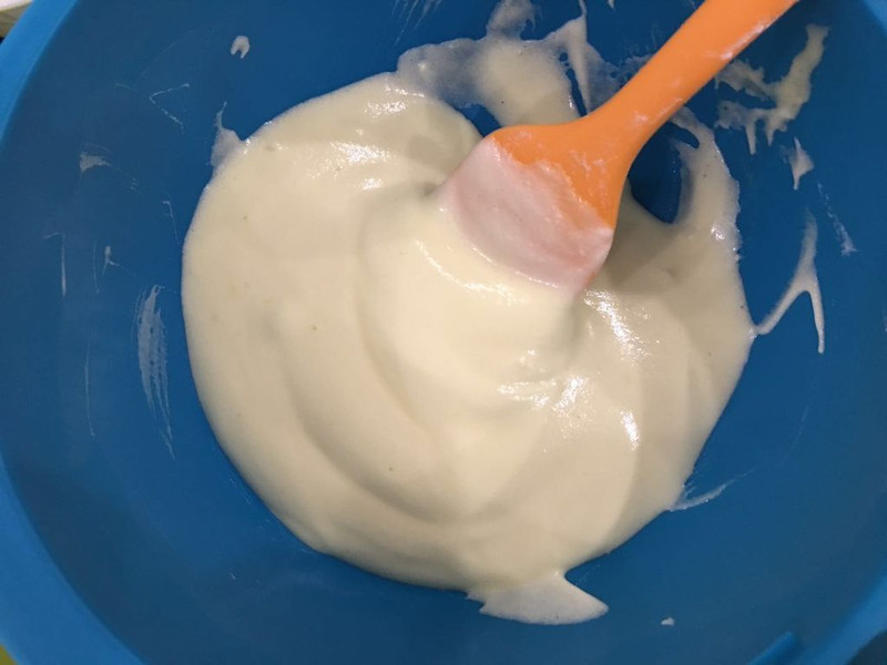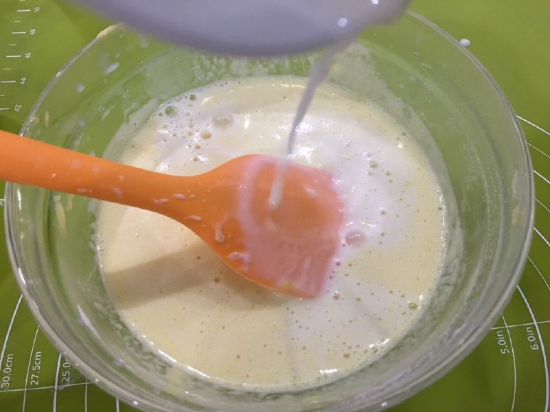 先盛1/3蛋白发泡到蛋黄面糊里,切拌均匀。