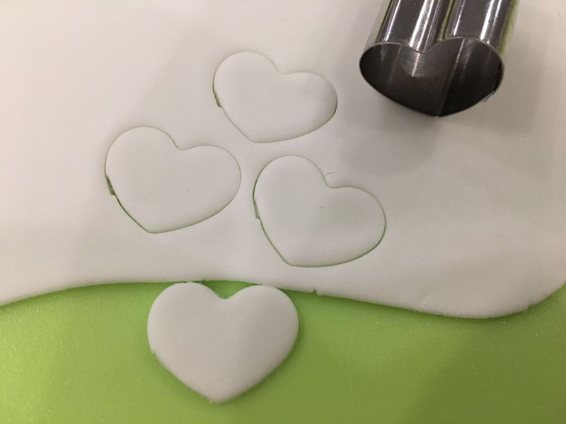 把白色翻糖膏擀成薄片,用小桃心压出心形白耳朵。