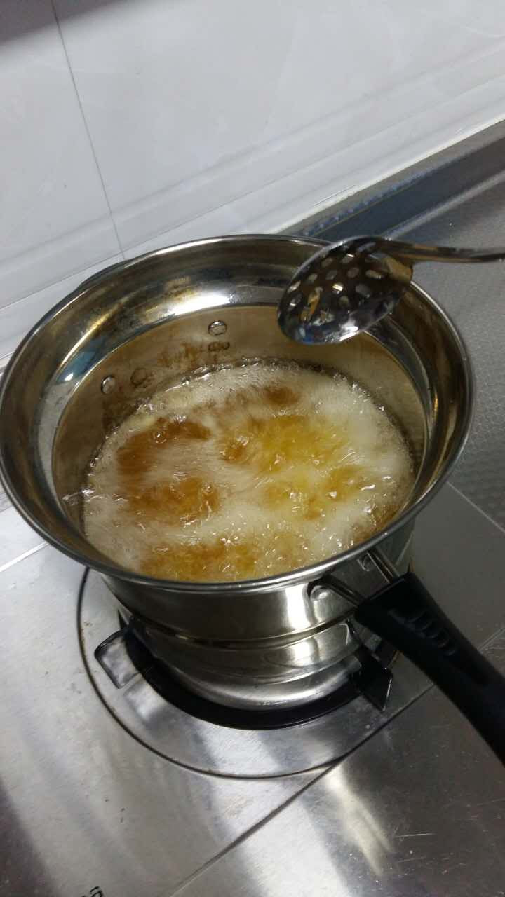 先烧半锅水待会煮土豆,土豆削皮后切成角状,直接放锅里煮至土豆角七分熟,自己控制,实在不懂拿牙签戳一两个看看。煮好后捞出放厨房餐巾纸上吸水晾干表面水分,我是在夏天,干的很快,我直接放篮子里就冷冻了。图片是冷冻隔天取出来的,很容易分开,并没有冻成一坨后难以分离,实在有几个分不开的话,炸起来自然会分开。炸薯角的烹饪技巧