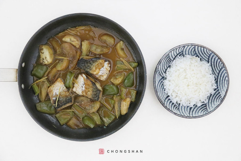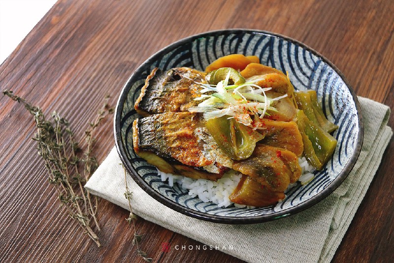 青花鱼是深海鱼,刺少肉鲜,低热量却营养丰富。味噌是一种用黄豆等食材发酵后做成的酱,味道浓醇芳郁。经过煎烤后的青花鱼与味噌、料酒一起炖煮,减少腥味的同时,更增添肉质的鲜嫩口感。茄子和青椒是和味增最为搭配的蔬菜,并增添盖饭的美味。