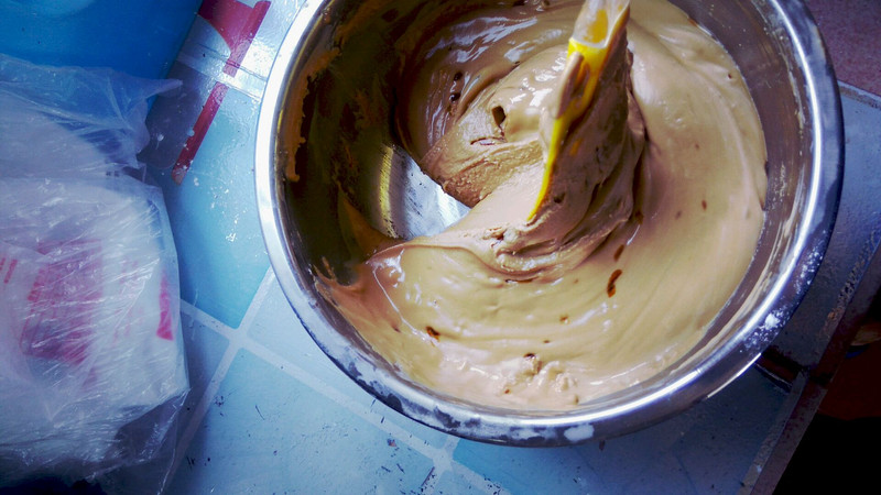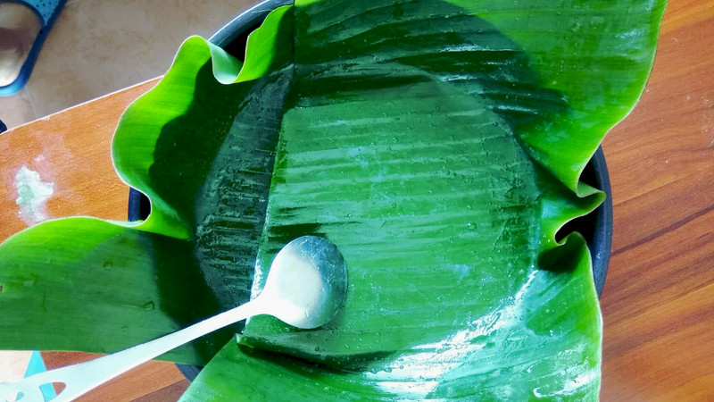 看年糕的薄厚来预计蒸的时间,不要太深的容器,容易中间蒸不熟,没有芭蕉叶就用保鲜膜,要不然很粘,不确定熟没熟用筷子在最厚的位置插一下没有米浆带出来就是熟了