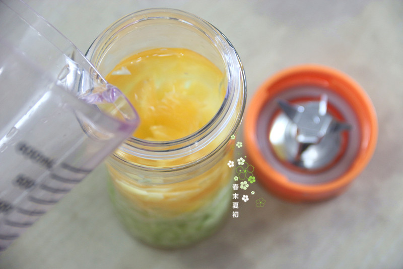 这道果蔬汁,用青瓜为主,再放入包菜丝,水果方面用的菠萝肉(无眼凤梨)、橙子肉,喝起来是青瓜味,很淡很淡的甜味。