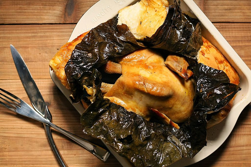 4、因为有荷叶去腥结腻,所以没有用葱姜做调味,如果怕不保险的话可以在鸡腹部塞入几棵葱及姜片一起烘烤。