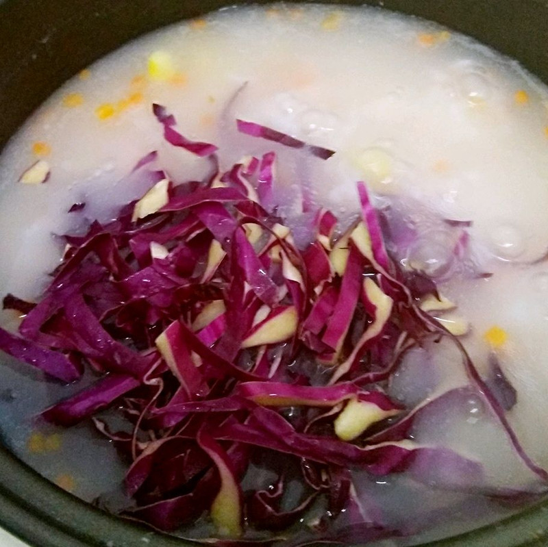 紫甘蓝胡萝卜玉米火腿粥的做法
