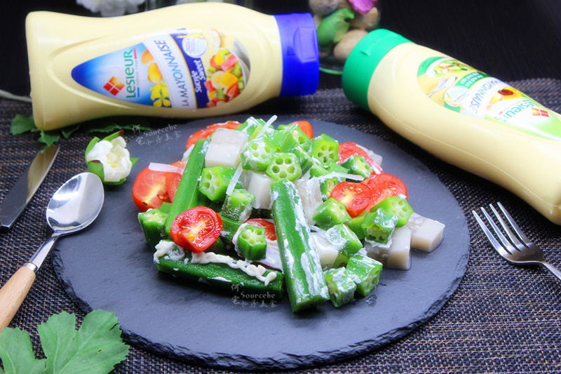 沙拉制作简单,但是要想好吃有营养健康的沙拉却很难。养生沙拉选择是的新鲜的秋葵、圣女果、还有胶原蛋白丰富的的水晶猪皮冻。再配上蛋黄酱,拌一拌就可以很美味的吃。