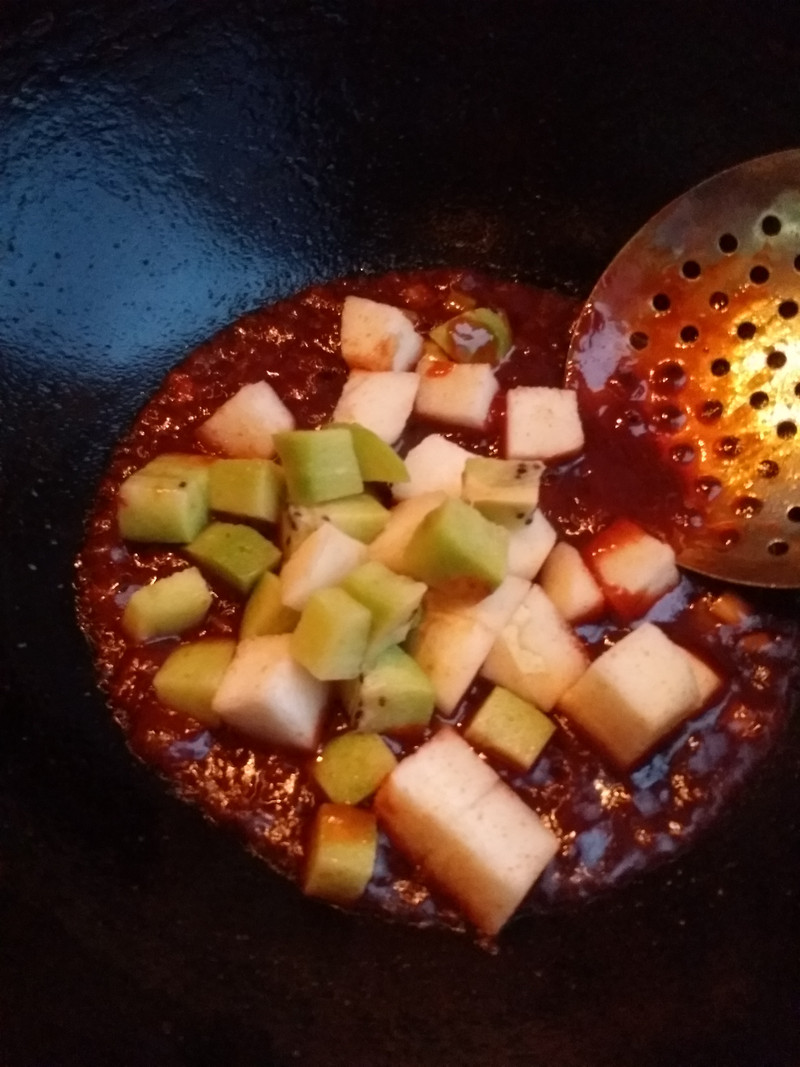 水果下锅要快速翻炒出锅时间过长影响囗感。