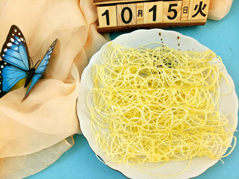 1.面糊按一定比例调制。2.裱花袋口一定要剪小口。挤出来的面线才香脆。3.平底锅里面不用放油。4.一定要用小火哦。