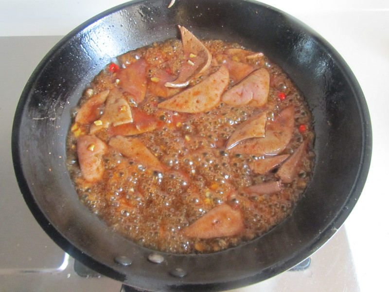 自从喜欢上吃铁板菜后,就买了铁板自己在家折腾,今天就买了块猪肝来准备做个“铁板洋葱爆猪肝”,猪肝要切的薄一点,滑炒嫩一点;而洋葱和青椒微微煸炒后放在加热的铁板上垫底, 再将爆炒好的猪肝连同汤汁一起倒在铁板上。当滚烫的爆猪肝浇淋在洋葱等食材上,通过铁板传热,发出吱吱悦耳的响声,让这菜更平添了浓郁鲜香的味道, 好诱人呀。