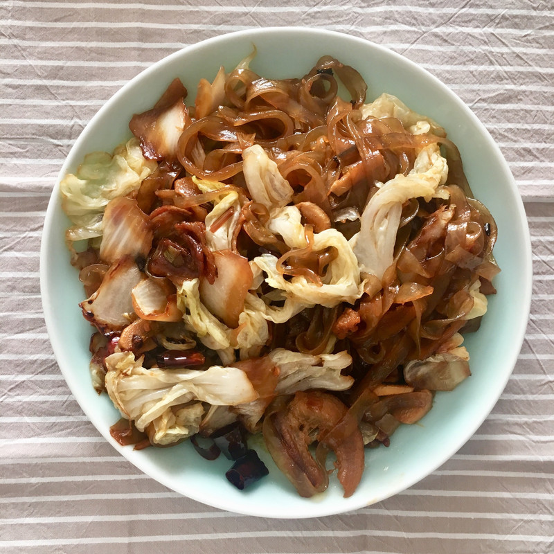 每次买一棵白菜都要吃好久,变着花样吃。原本只是懒得买菜,想着做白菜炖粉条好了,但又想到前两天刚吃过白菜炖豆腐,一时不想吃炖菜。于是就突发奇想,把一道东北炖菜改成了炒菜,没想到更受欢迎,吃完盘子里只剩下姜片和红辣椒了。