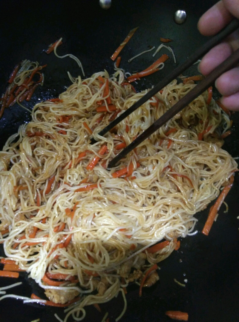 2、用筷子快速翻炒面条,比较锅铲,更便于将面条打撒,将水分炒干,根根入味。