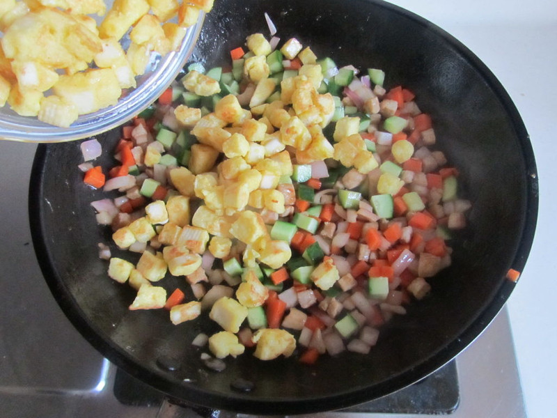 1. 蛋液一定要等到准备制作时才能倒入馒头丁中混合, 放早了让馒头丁吸收蛋液过多变得皮软;蛋液的量也要控制好; 2. 炒菜时注意蔬菜下入的顺序,基本按照易熟顺序放入,注意馒头丁要等到最后一步放入,就可以加盐调味了。