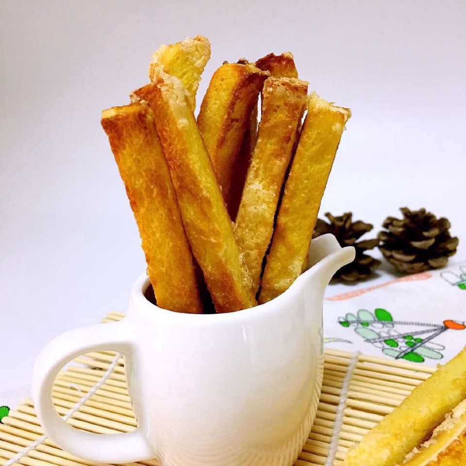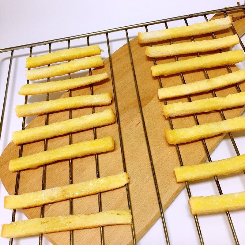 1、吐司边裹好鸡蛋液、再裹好白砂糖。