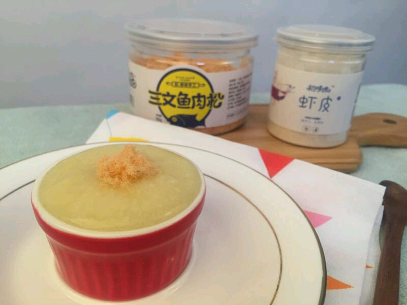 ②食材:扇贝肉30克,土豆50克,虾皮粉一勺,三文鱼松适量。