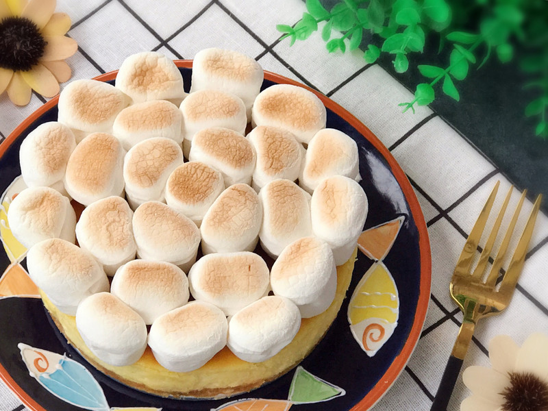 香烤棉花糖起司蛋糕~将棉花糖摆在烤好放凉的起司蛋糕上的时尚吃法。棉花糖只要烤上色,口感就会变得滑嫩浓稠,与香浓的起司蛋糕结合在一起,绵密美味。