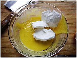混合:将1/3打发好的蛋白放入蛋黄糊中,用刮刀从底部向上面翻拌,不要画圈和过度搅拌,一定要拌匀