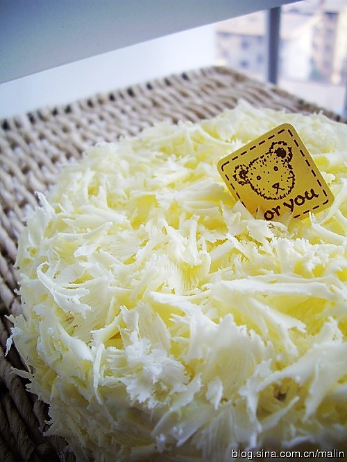 白巧克力砖冷藏后用小勺刨出巧克力碎片(如果没有巧克力砖,可以把其他形状或大小的白巧克力融化以后冻成砖形,比较好用。)