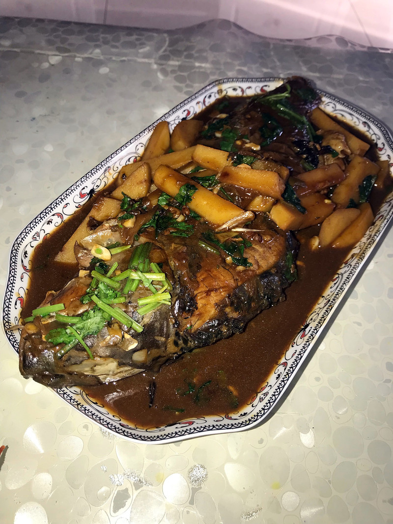 这道菜就是这么简单!大家炖鱼的时候观察点汤,要是鱼还没入味汤快没了就再加点热水继续炖就行,我今天放的土豆条,其实放点白菜 茄子 粉条都行,看大家口味!黄酱就够咸了所以不用放盐!