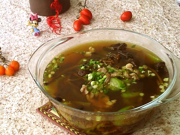 相对于炒与烧,更愿意用菌菇类食材做汤。在征询了意见之后,决定用茶树菇做汤,这个做法一般还是能被接受的。顺带加入了一些黑木耳,而丝瓜原是要炒的,临时起意,加入了这个团队,为之增添一抹青绿。泡发茶树菇的水没有扔掉,而是滤除澄清液,一同煮在汤中,减少营养流失。