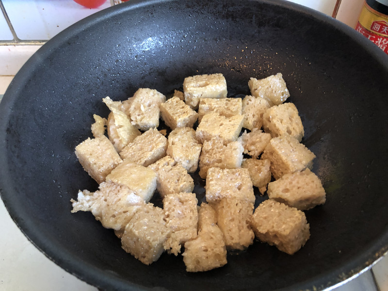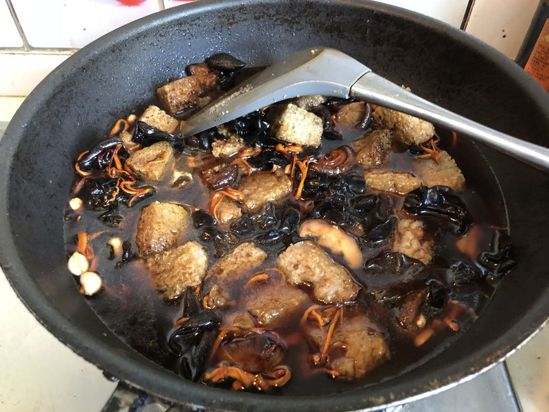 四喜烤麸是一道上海名菜,也是上海人年夜饭中的常见冷菜之一。通常将烤麸、金针菜、木耳、花生米洗净了过油炒,成菜后香香甜甜。烤麸发得好的话,嚼起来会略有弹性,有浓重的酱汁从孔里渗出来,回味无穷。今天我家里没有金针菜,只有虫草花干,所以就替换了一下!