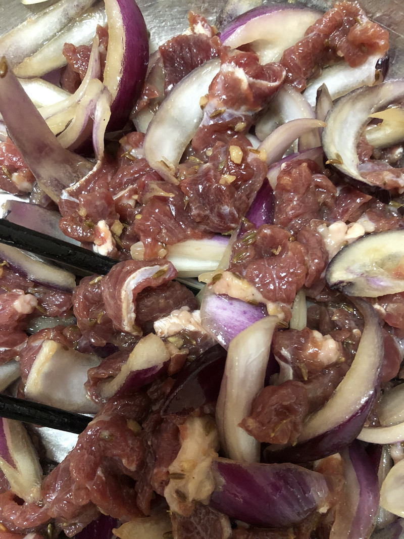牛肉腌制半小时以上入味比较好,姜选用姜粉,孜然可以用孜然粉和孜然粒多放一些,油要多放