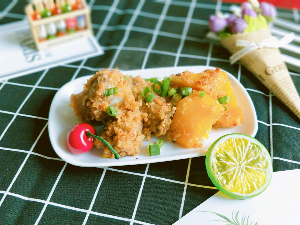 做此菜是建议分开蒸熟再混合,以免红薯最后变成泥,另外排骨不宜太干,保留一点水分拍上蒸肉粉才不会口感太干,保持好口感还有个关键是蒸之前均匀的淋一点点香油,口感更佳。