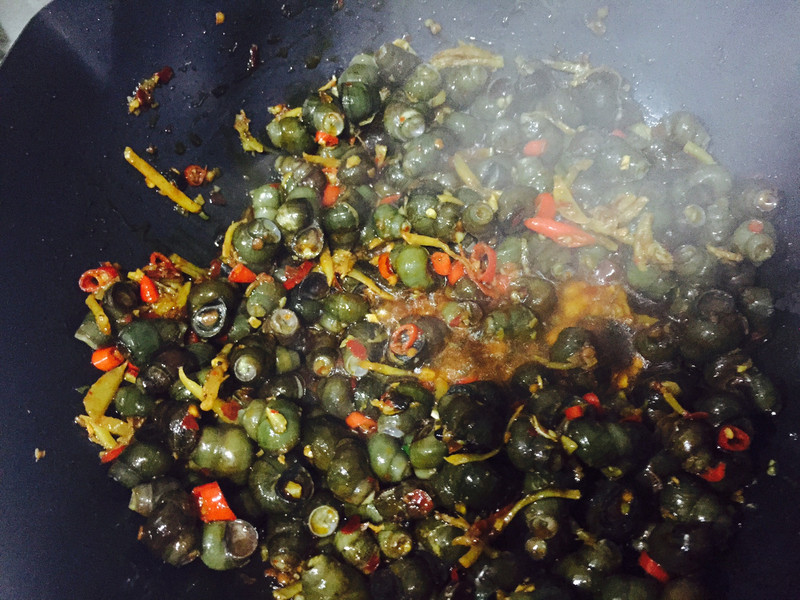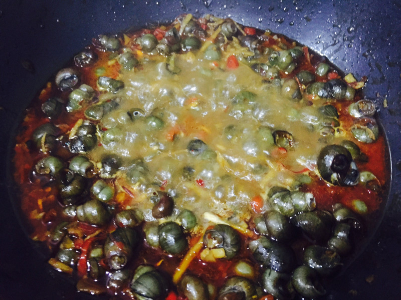 很多人炒螺丝不喜欢有最后一步,加水进去然后焖一会儿,但我喜欢吃比较入味儿的东西,所以焖了一会儿。其实螺丝还有一种吃法,相当于是炖了,在锅里炖4小时出锅。下次我也试试。