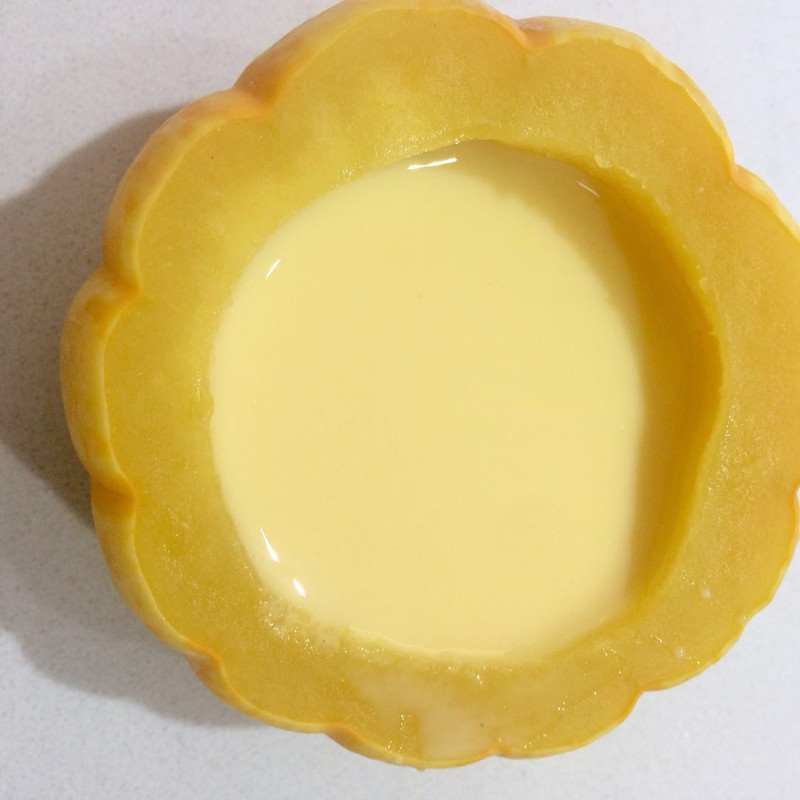 3、南瓜放锅蒸10分钟后拿出自然冷却以后再加蛋奶进去哦