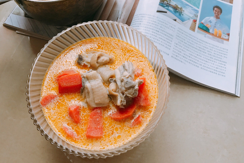 鸡肉煮熟就可以,无需像炖中式鸡汤煮很久。