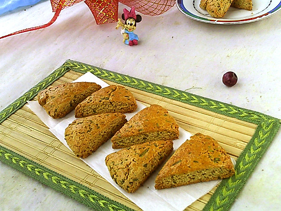 世上本无事,庸人自扰之。木有,没关系。自己发明一个。借用君之的方子,采用经典的三角形状,加上冰箱里亟待尽快解决的迷迭香,一道迷迭香全麦司康就此问世。全麦的司康起发不太高,看起来更像是饼干,而粗糙的样子与口感却让人想到曾经乡村的玉米饼。非此好者需绕行。