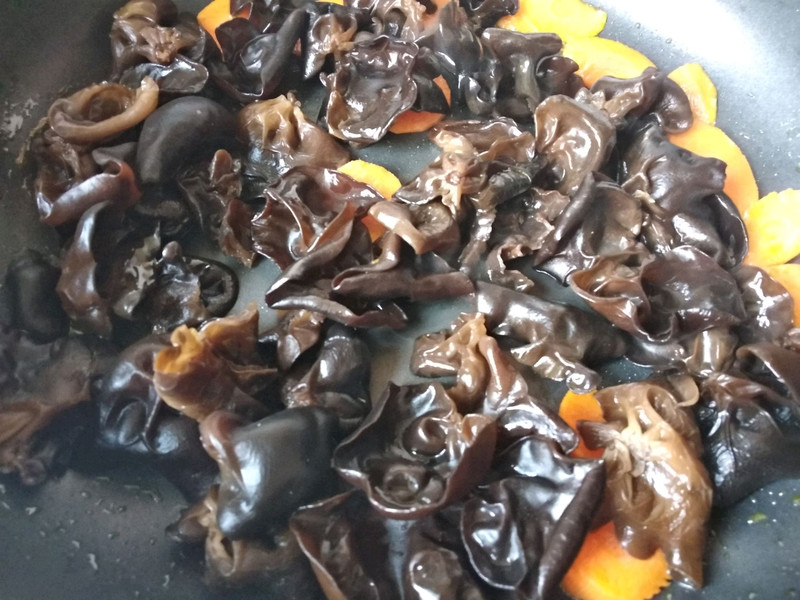 黑木耳、胡萝卜、青椒炒黑椒巴沙鱼片