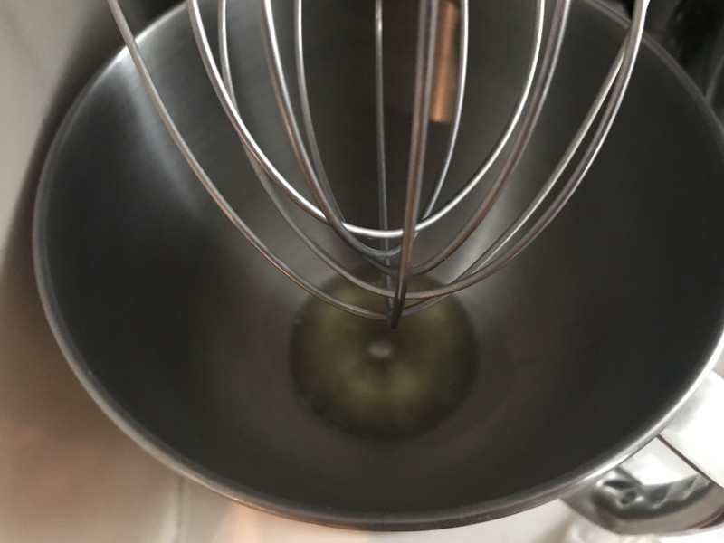 再来做蛋糕底。在干净的厨师机中先用厨房纸蘸点白醋,擦拭厨师机内壁和打发头,然后放入室温蛋白