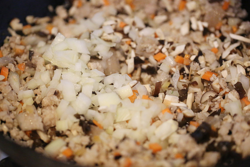 8、每加一道馅料炒的动作要快,不用炒熟,这样蒸出来才能让各种味道慢慢互相渗透。