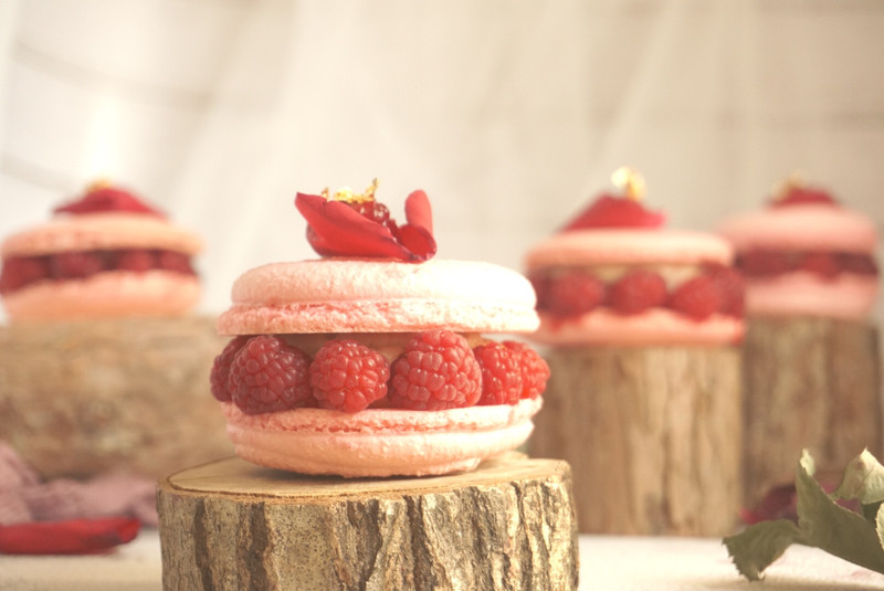 这个意式马卡龙比普通的大4倍以上才能塞得下覆盆子围边,特点是玫瑰荔枝白巧克力酱和新鲜覆盆子和罐头荔枝肉。